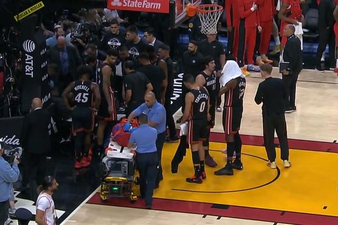 在比赛进行到第一节末段时,热火队发动反击,在反击中约维奇接到哈克斯的传球起飞上篮,但遭到了猛龙队元的封盖阻挡重重落在地上。落地后的约维奇非常痛苦,他在地板上捂着自己的胳膊,这也让身旁的队友抱头沮丧。